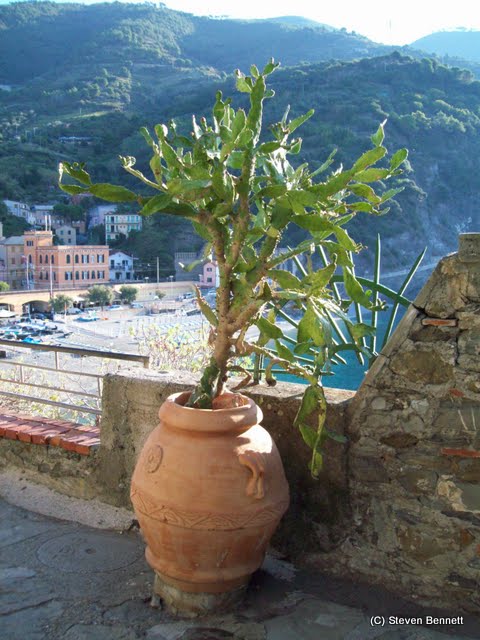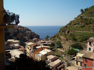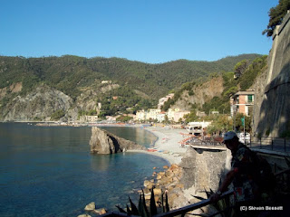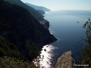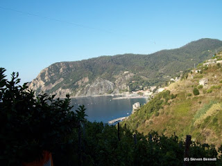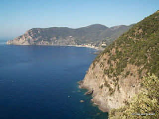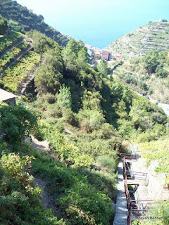 The beginning of the trail (mainly 100s of steps) climbs up from Monterosso through small terraced vinyards, up along the cliff edge above Monterosso, up and down some ravines emerging high above the town of Vernazza. The path descends into the town via another series of steep paths and steps. 3k up and down steps is a long way! However the views were magnificent and it was great descending into the town from above.